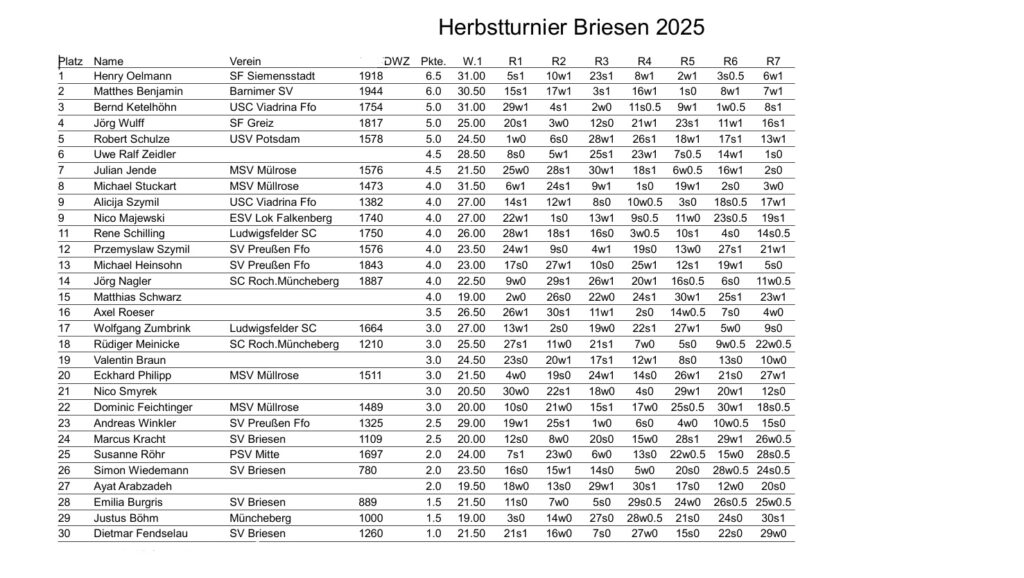 Mit insgesamt 30 Teilnehmer*innen, darunter sechs Kinder und Jugendliche, war das Turnier erstaunlich gut besucht – vor allem, wenn man die Anzahl der anspruchsvollen sieben Runden bedenkt! Besonders gefreut hat uns, dass einige Spieler*innen das erste Mal den Weg nach Briesen gefunden haben und auch Teilnehmende sogar ihr allererstes Schachturnier bei uns bestritten haben.